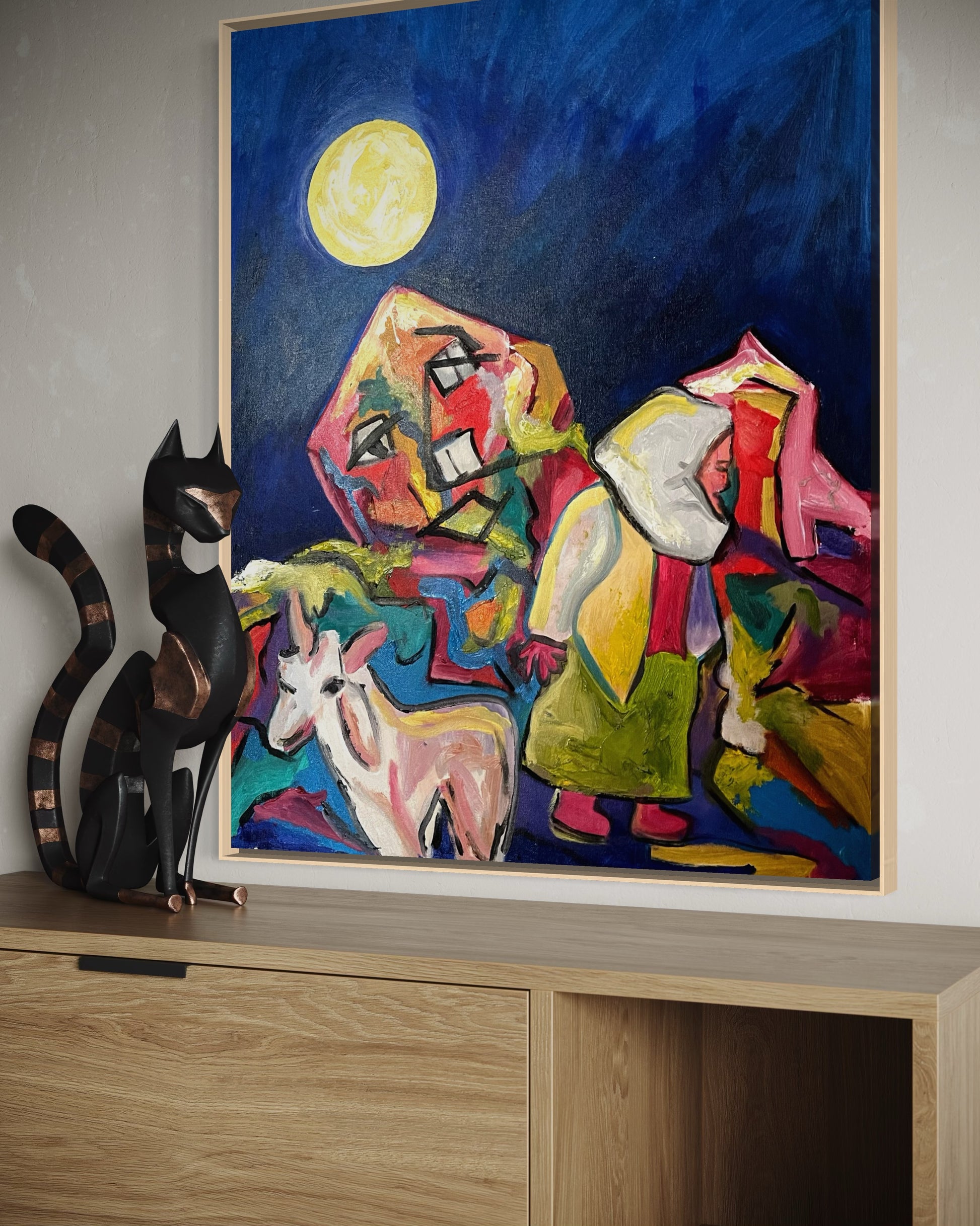 Earthquake Turkish Woman's Sad Work: An abstract night scene under bright moonlight, where strange figures come together in vibrant colours.I made this as an old historical painting; prints are for sale if you're interested. Originals are for sale.