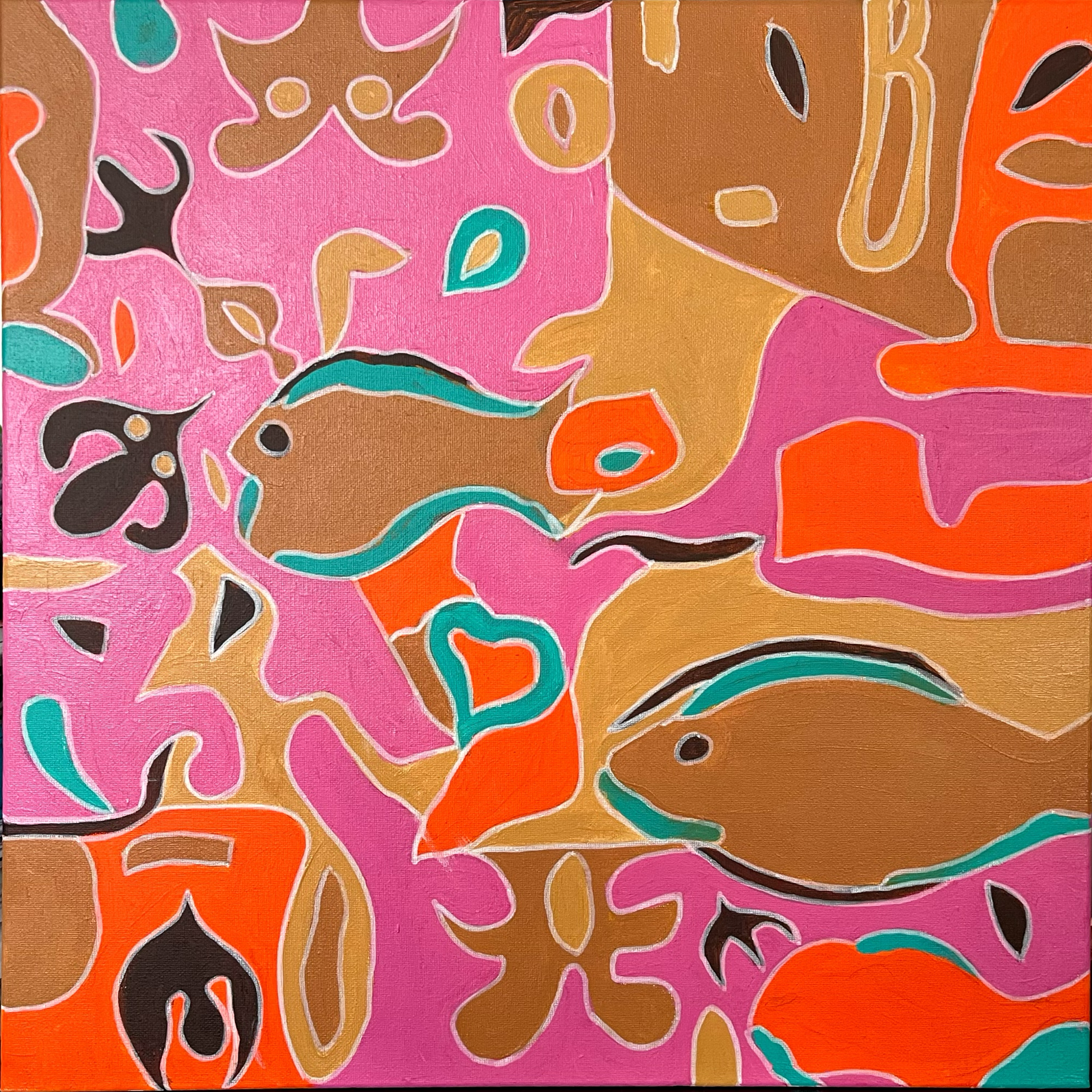 A vibrant composition of interwoven shapes and colours captures a joyful sense of unity. Everything was done with acrylic painting, and then the designer used a pen.